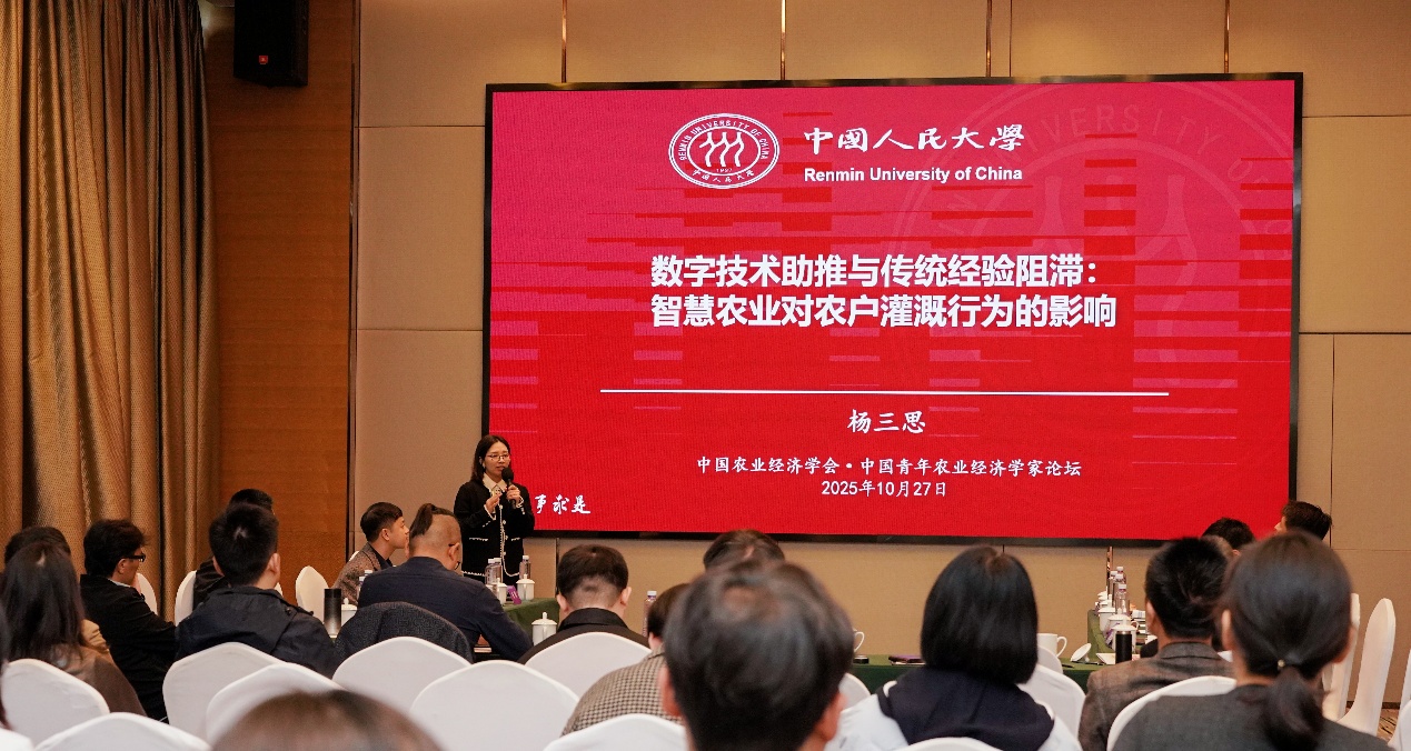 在年度主旨报告环节,中国人民大学农业与农村发展学院副教授杨三思作题为“数字技术助推传统经验阻滞:智慧农业对农户灌溉行为的影响机制”的报告;北京大学现代农学院副教授朱炯作题为“农村要素市场配置及其福利效应的一点思考”的报告。两位青年学者的研究从数字技术赋能农业生产、农村要素市场改革等角度,探讨了“十五五”时期中国特色农业现代化发展的未来方向。