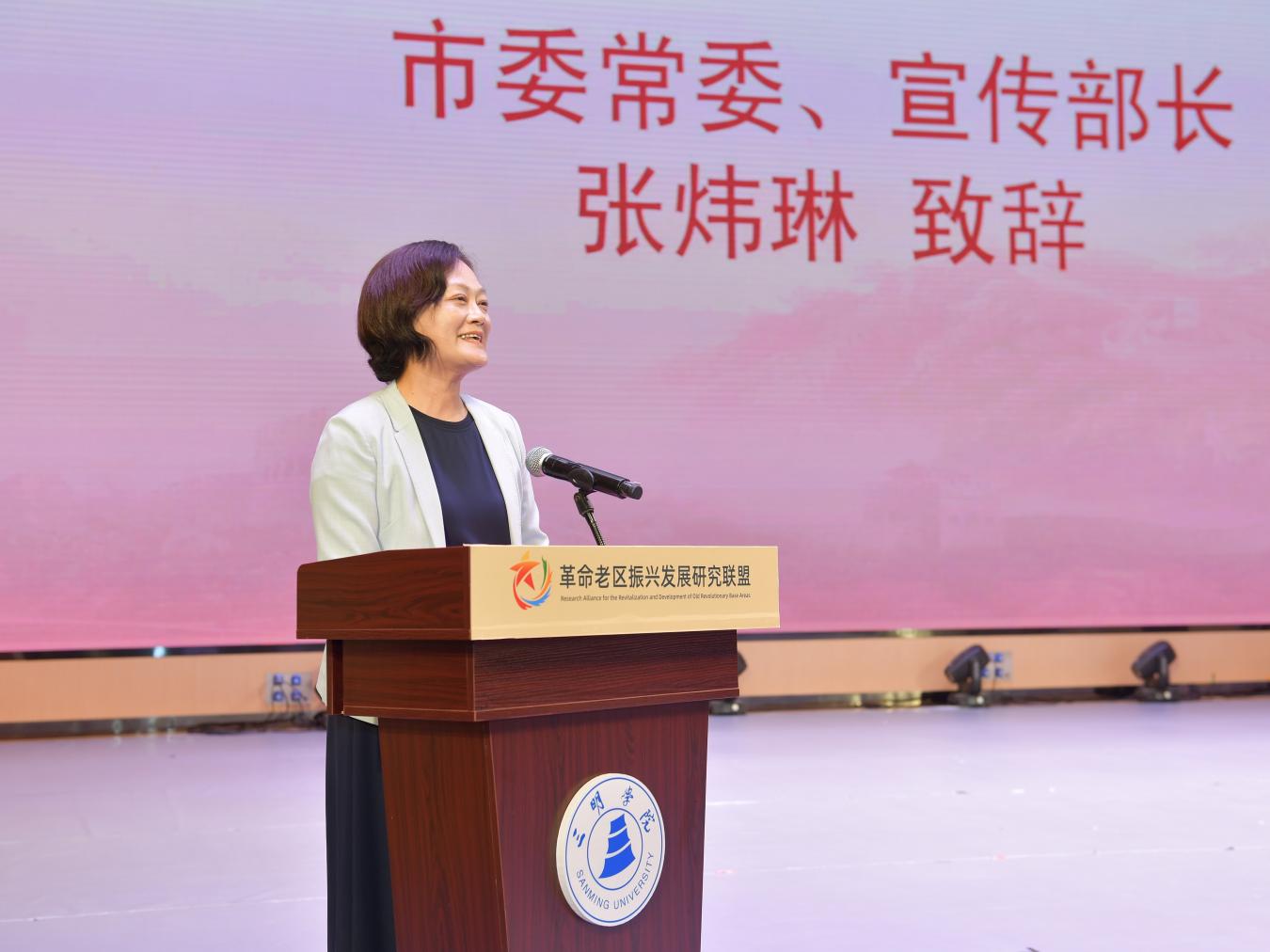 三明市委常委、宣传部长张炜琳指出,革命老区振兴发展是习近平总书记亲自推动的国家战略,三明作为原中央苏区核心区,为中国革命作出重大贡献,如今正全力推进高质量发展示范区建设。当前三明处于发展关键阶段,亟需人才和智库支持,期待联盟高校深入研究和宣传三明,围绕中国式现代化老区路径建言献策。三明市将搭建多领域实践平台,促进研究成果与老区需求对接,推动更多成果落地和推广,助力老区振兴。