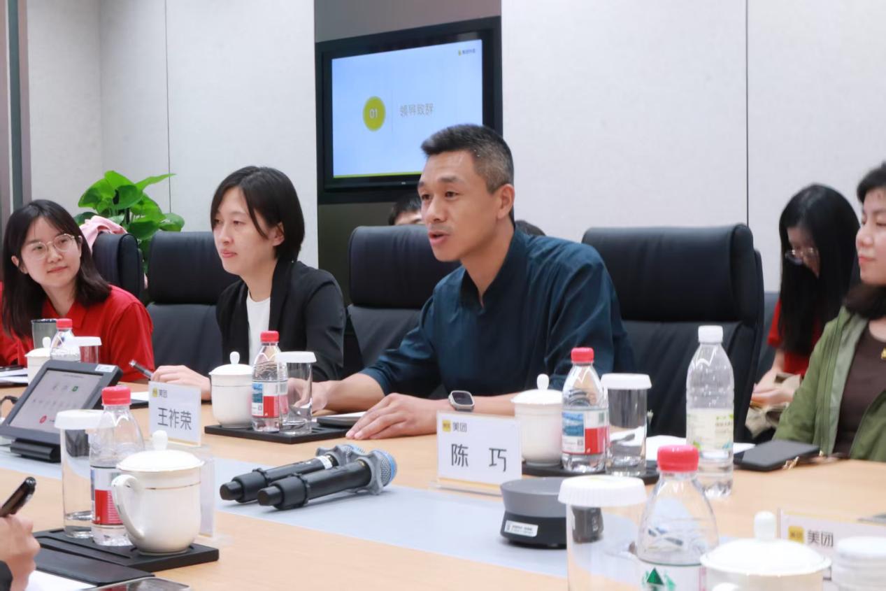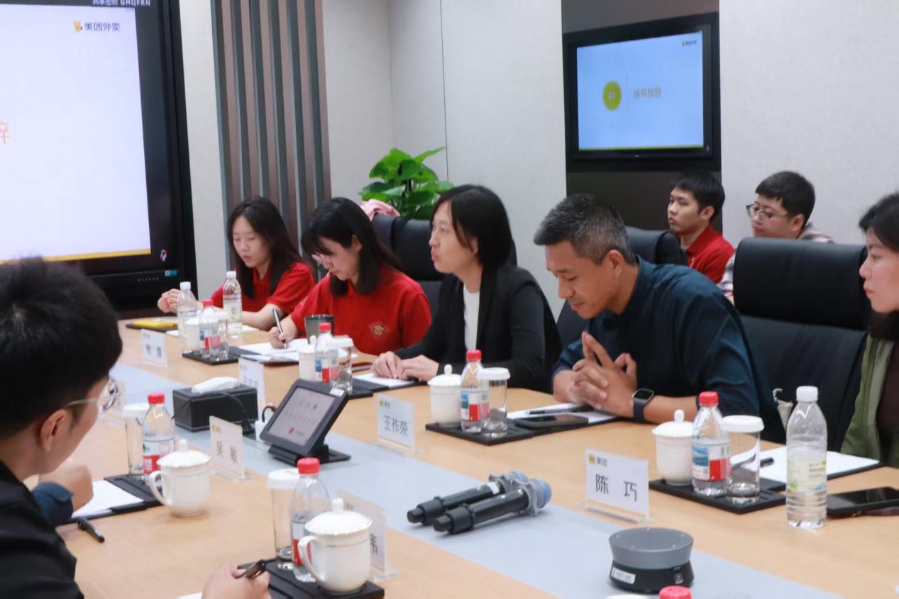 参观结束后,师生代表与美团外卖校园业务负责人吴敏总等美团代表们在会议室开展座谈会。此次座谈双方聚焦深度校企合作、产教育人,探索高校与企业共建课程、共研课题、共育人才的新路径。双方就如何发挥高校科研优势与企业实践资源,推动高校人才培养展开深入探讨。