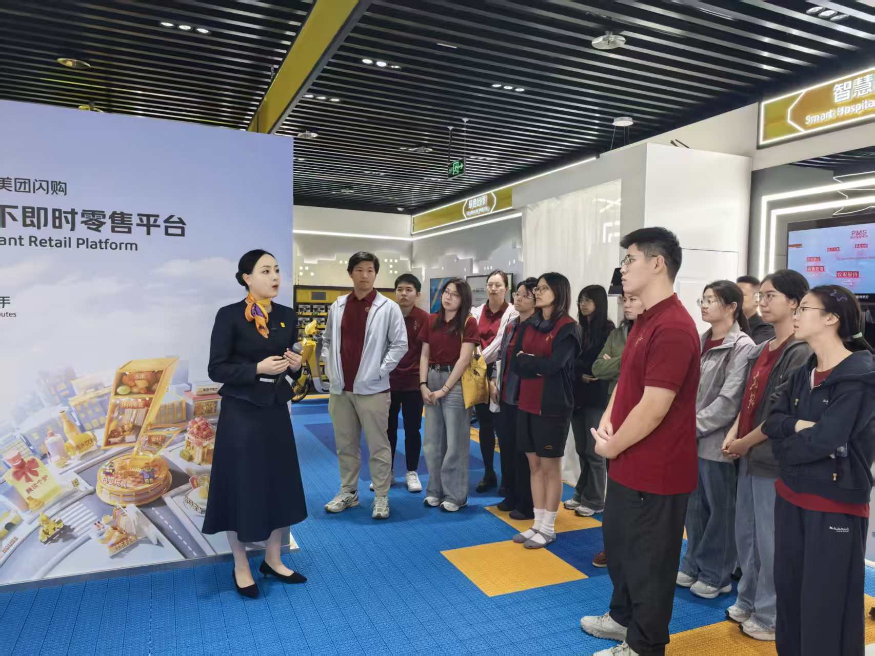 在美团指挥中心展厅,讲解员向同学们系统介绍了美团的发展历程、业务规模及国际化进程。在参观流程中,同学们全景了解美团在即时零售、数字化运营、即时物流等领域的技术与实践,现场观看“青山计划”等社会责任项目案例,体验绿色电单车、自动配送车、无人机、美团智慧大脑等创新应用,感受到美团“帮大家吃得更好,生活更好”的企业使命在民生场景中的具体落地。师生们切身感受到美团的科技实力与社会责任担当。