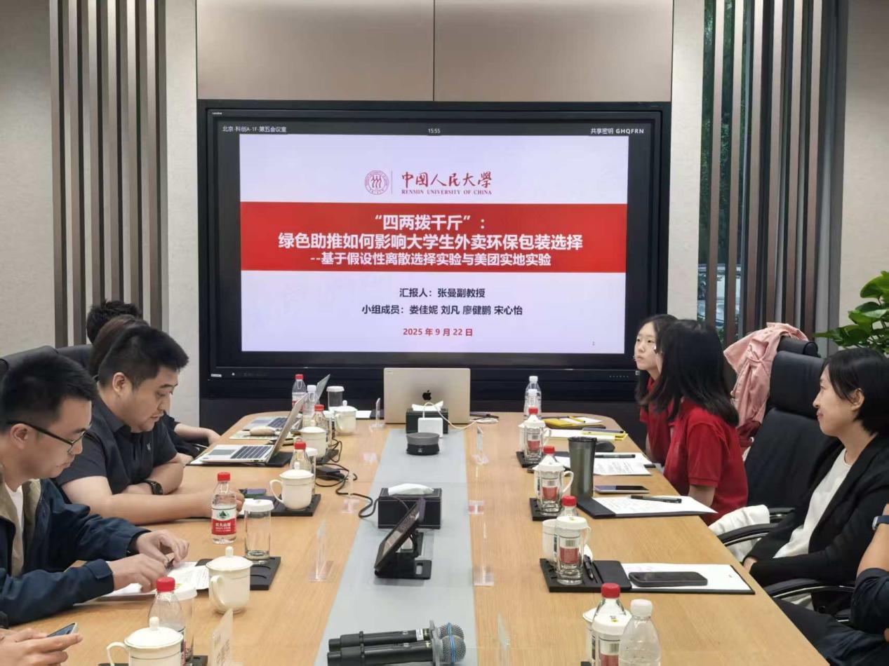 张曼副教授在座谈中介绍了与美团合作的“绿色助推”研究项目进展。该项目由张曼副教授指导,四位中国人民大学本科生作为科研骨干,基于行为经济学理论设计了六种信息干预方案,探索如何以低成本、非强制的方式引导大学生选择环保外卖包装。该项目还获得了中国人民大学“求是学术”品牌研究项目“强国”立项。张曼教授表示:“我们希望通过‘绿色助推’这一小切口,推动大学生形成可持续的消费习惯,同时也为企业绿色转型提供数据支持和政策建议。”